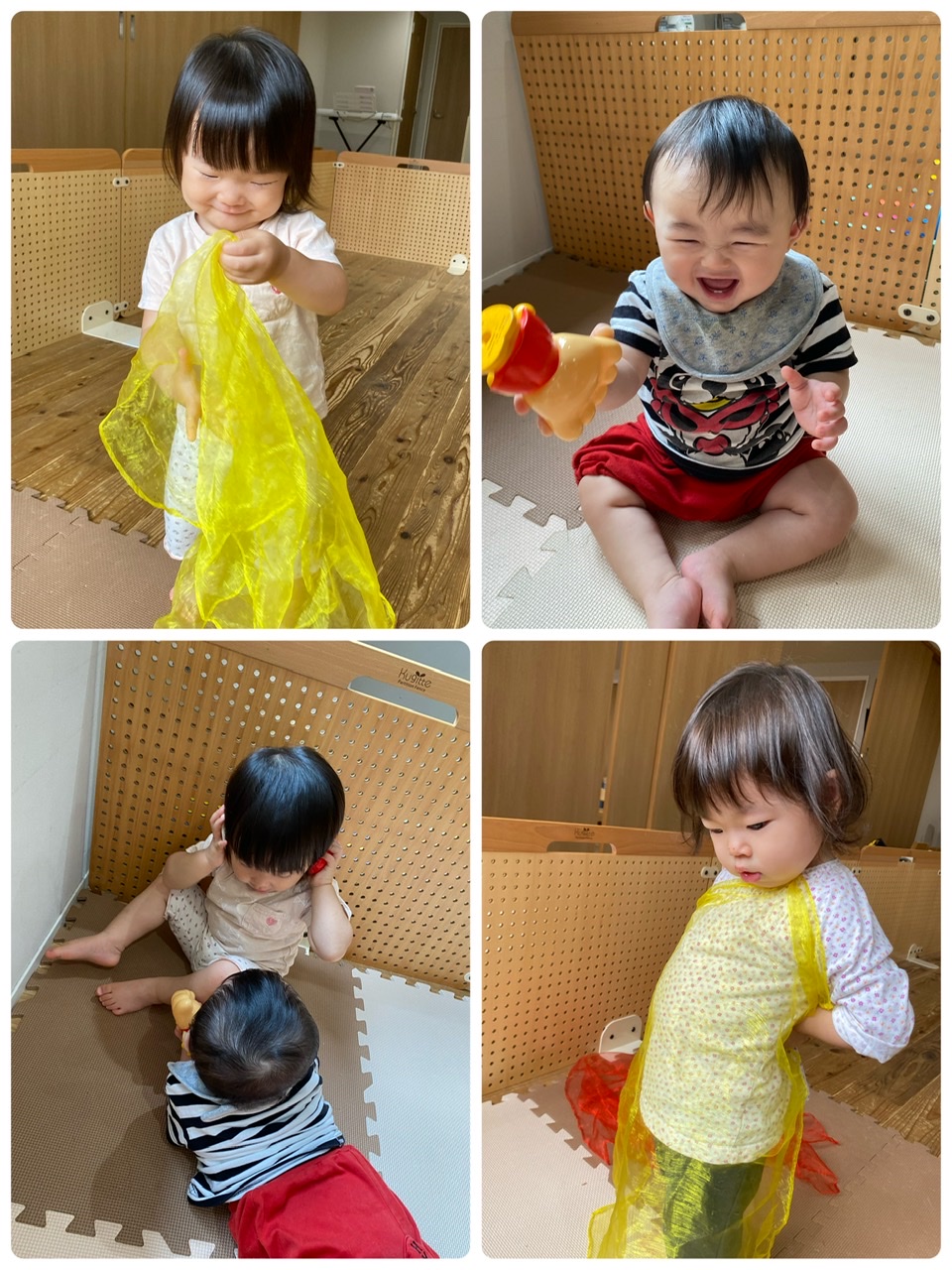 おひさま、ほし組さんはカラースカーフ遊びをしました!!スカーフを頭の上に乗せたり、「いないいないばあ」をするとニコニコ大喜びの子どもたちでした♡