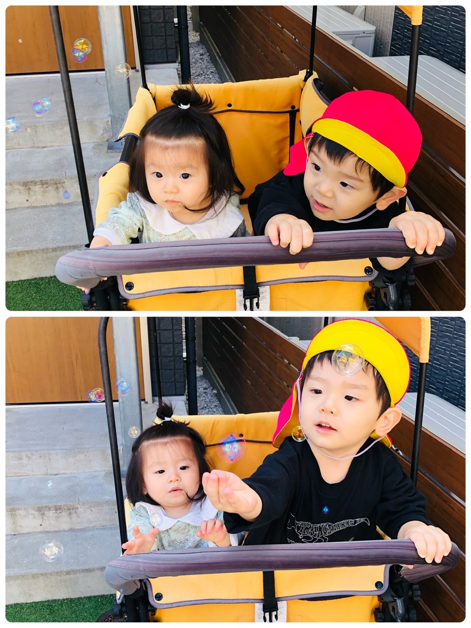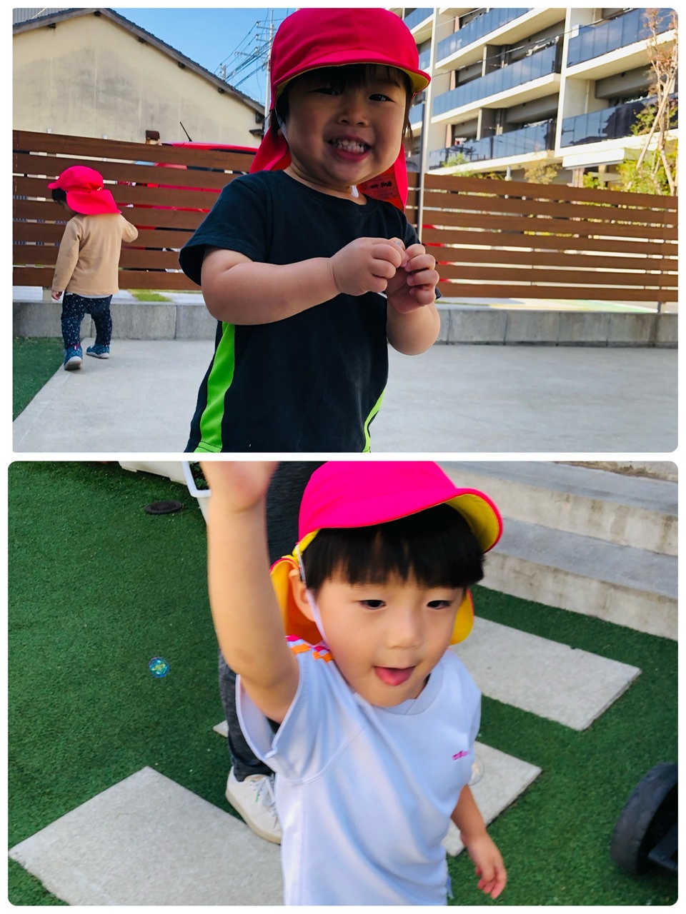 園庭でシャボン玉を追いかけ、シャボン玉に触れると大喜び(o^^o)