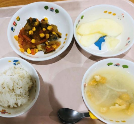 麦ごはん みそ汁 さわらの五目とろみ煮 リンゴ