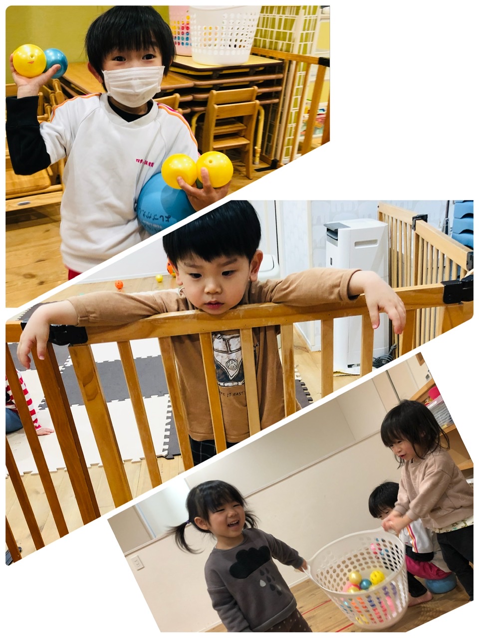 今日はお部屋で、ポンポンやボールを使って遊びました◎