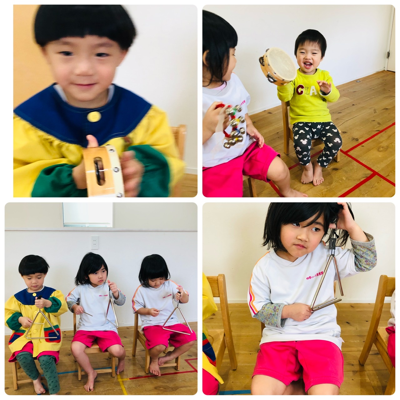 今日は4人のお友達と一緒に鈴を鳴らしたりタンバリンを叩いてみたり、トライアングルを優しく鳴らして過ごしました。
