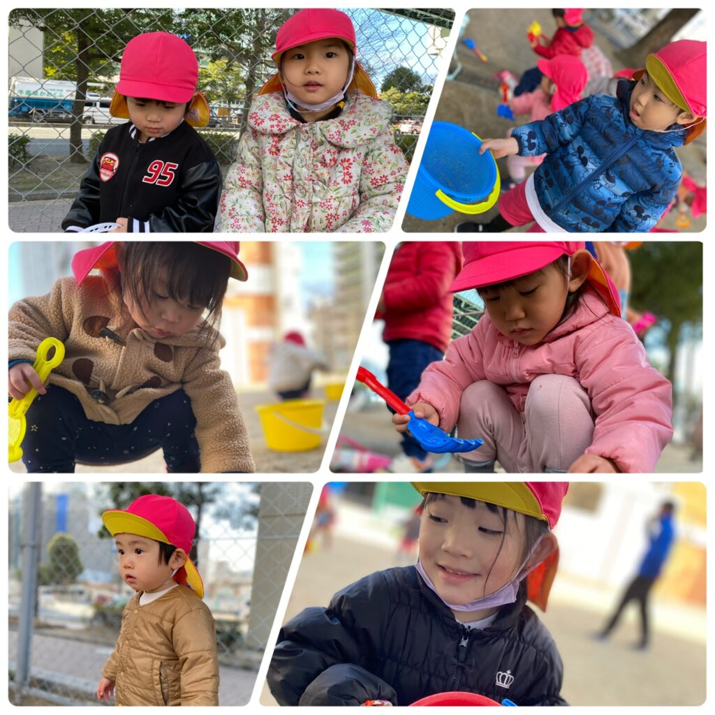 たくさん走ったり、お砂場セットを使って砂や葉っぱを入れて遊んだりしました(#^^#)