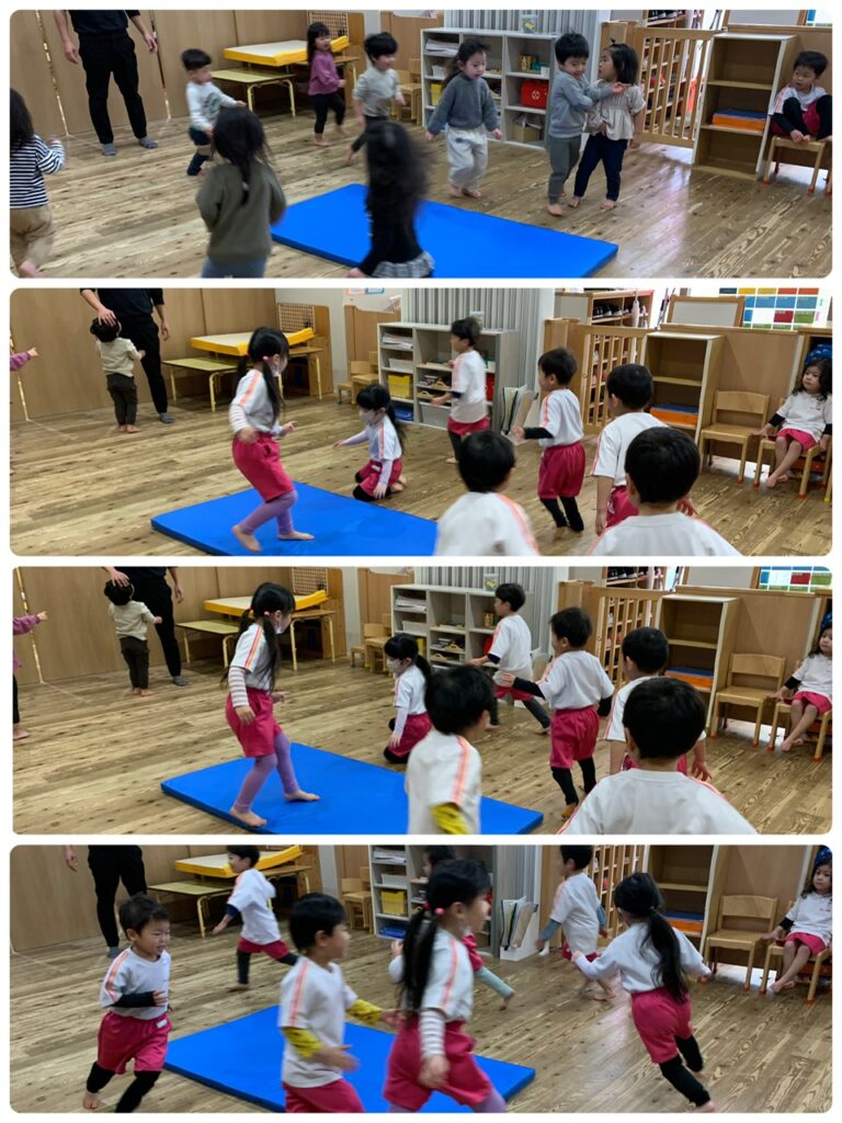 『お部屋でかけっこするからお片付けするよー!』という先生の声に大歓声で喜ぶみんな♬