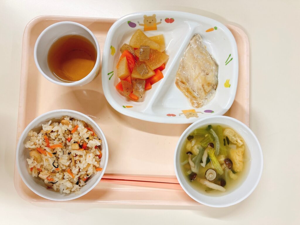 大豆入り混ぜご飯、サバの塩焼き、大根とこんにゃくの煮物、しめじの味噌汁