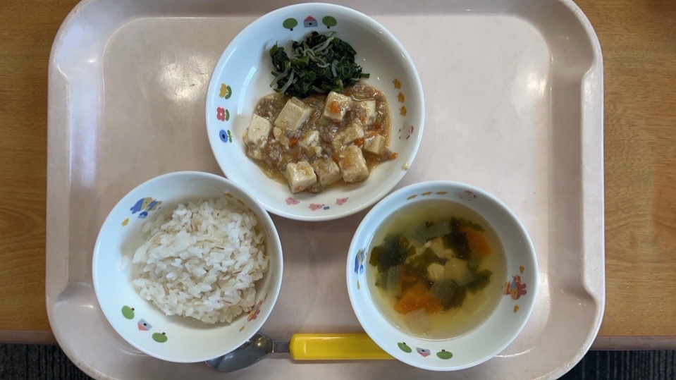 麦ごはん、わかめスープ、麻婆豆腐、ほうれん草のじゃこ和え