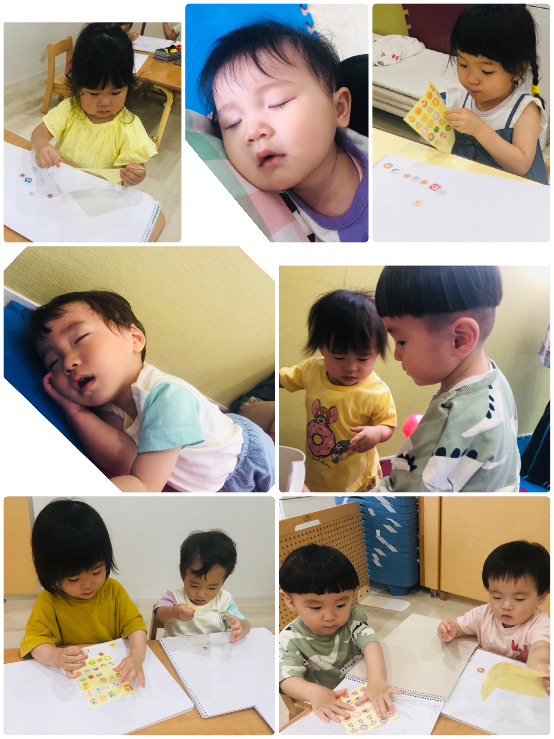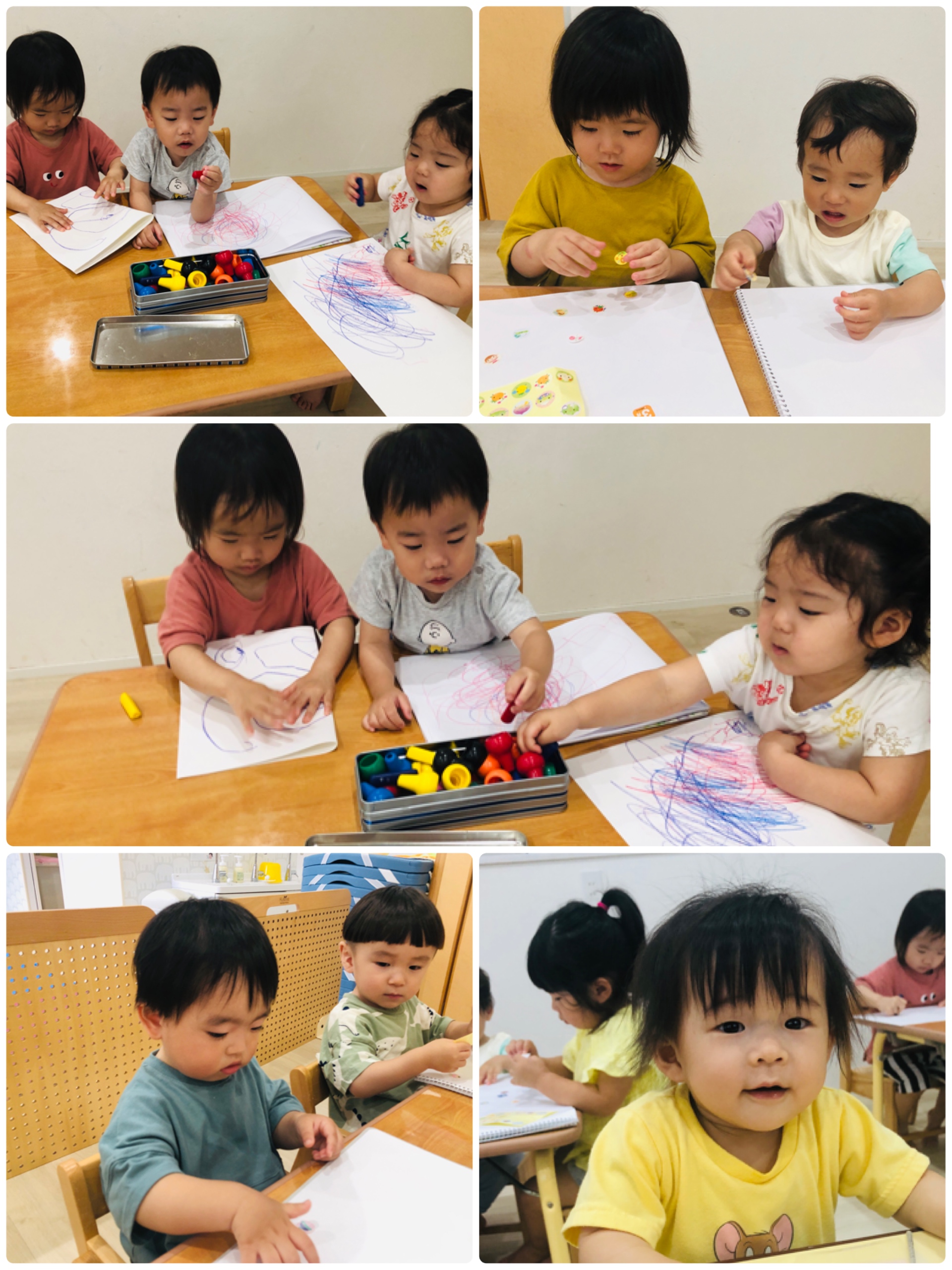 小さい組のお友達はアンパンマンの歌でみんなで楽しく歌ったり、シール貼り遊びなどをしましたよ(^^♪