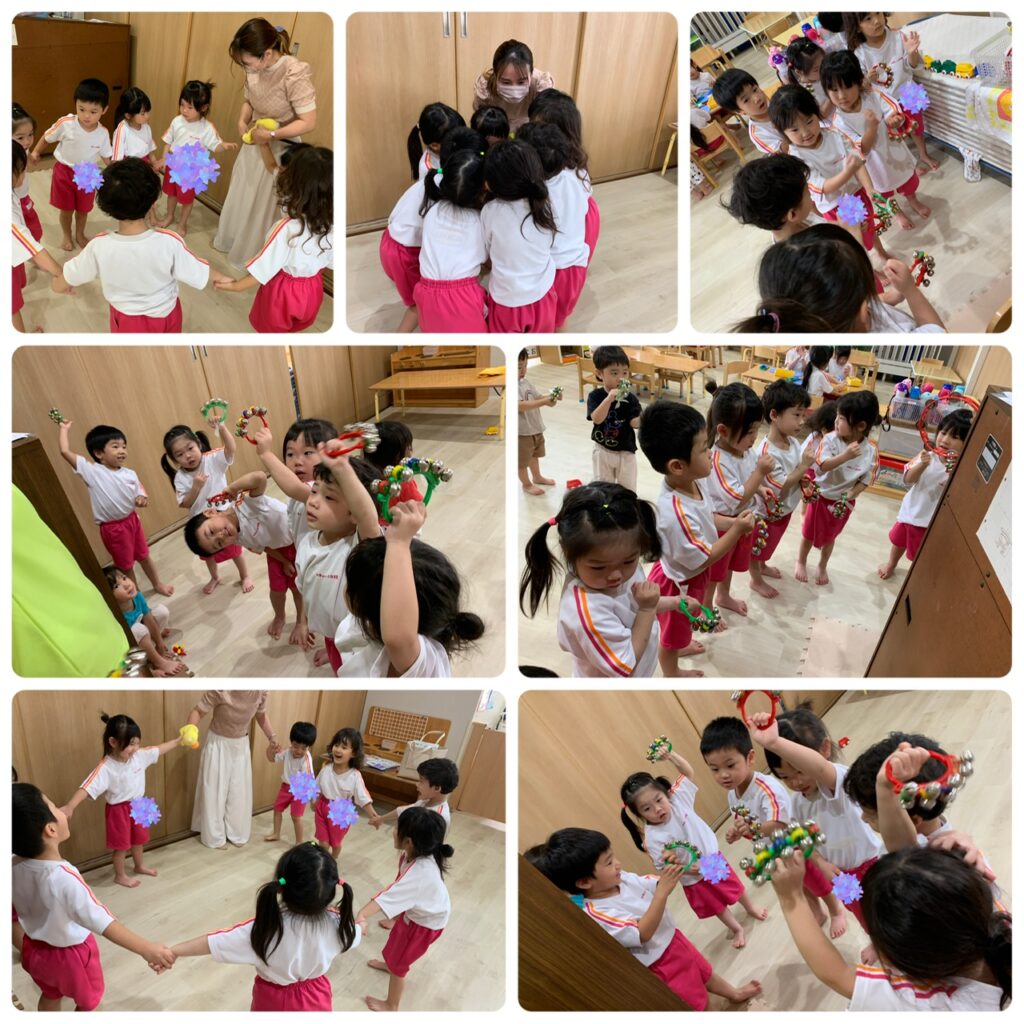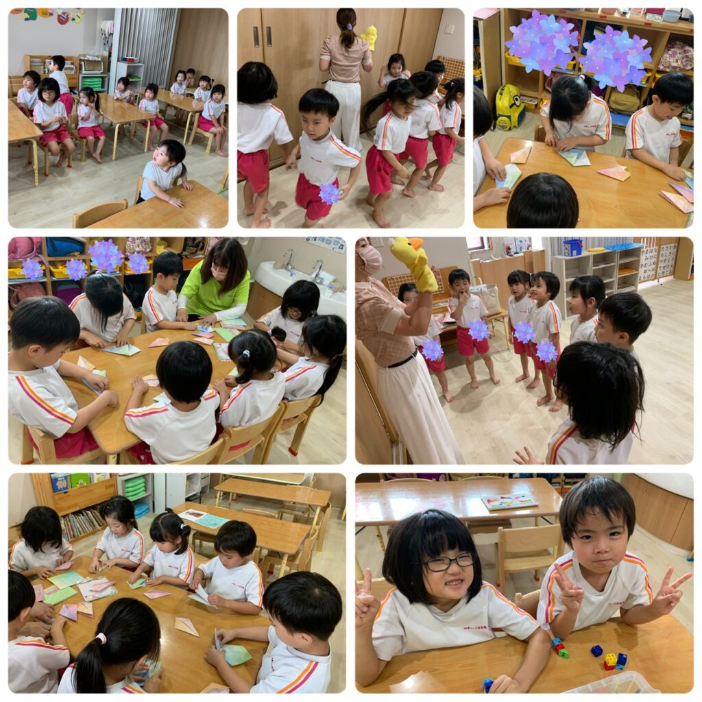 あおぞら、にじ、ひかり組さんは、英語教室がありました!!その後は、折り紙をしたり、楽器でリズム遊びをしたりして楽しく過ごしました!!