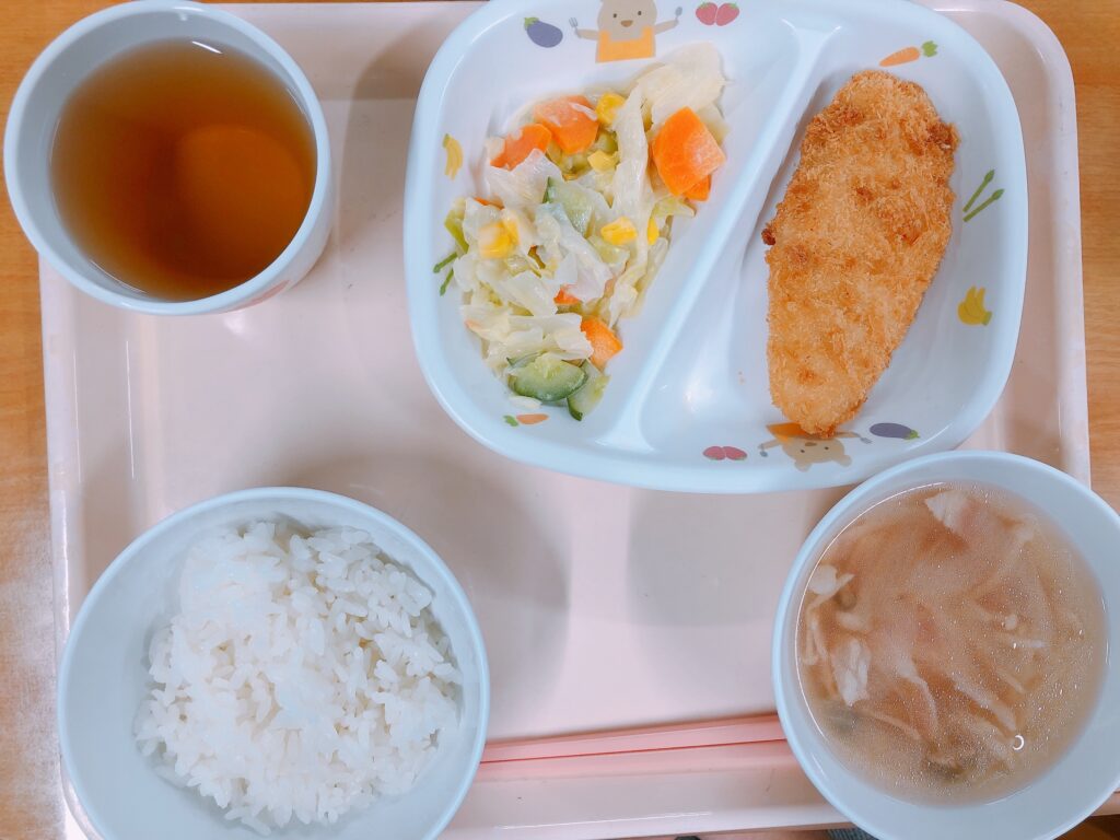 ご飯、ささみチーズフライ、キャベツサラダ、きのこのコンソメスープ