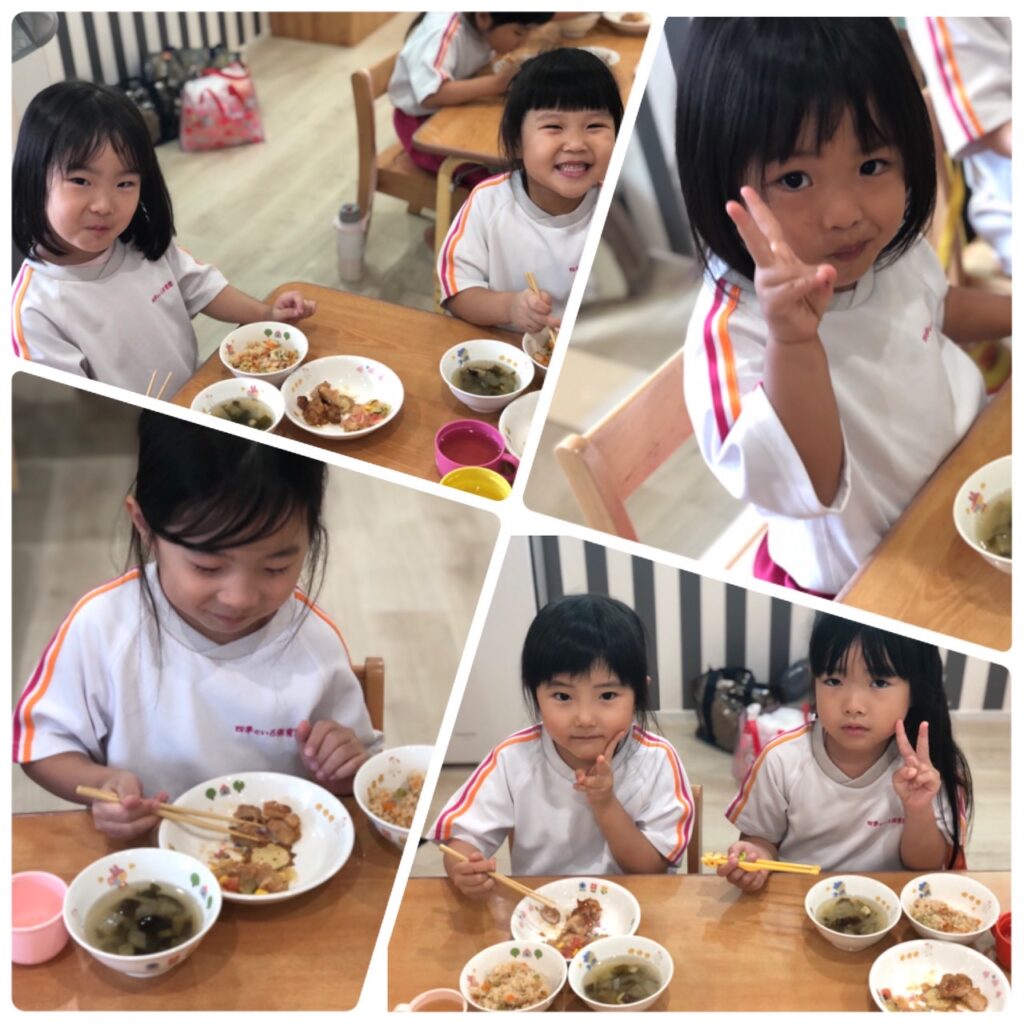 いっぱい遊んだ後は給食をもりもり食べていますよ~(^^)/