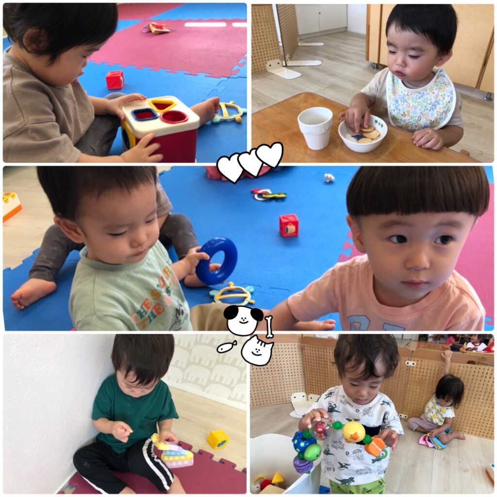 小さいお友達は朝の会でトントントントンひげじいさんなど手遊び歌を楽しくした後は、それぞれ好きなおもちゃで遊ぶのに夢中(*^▽^*)