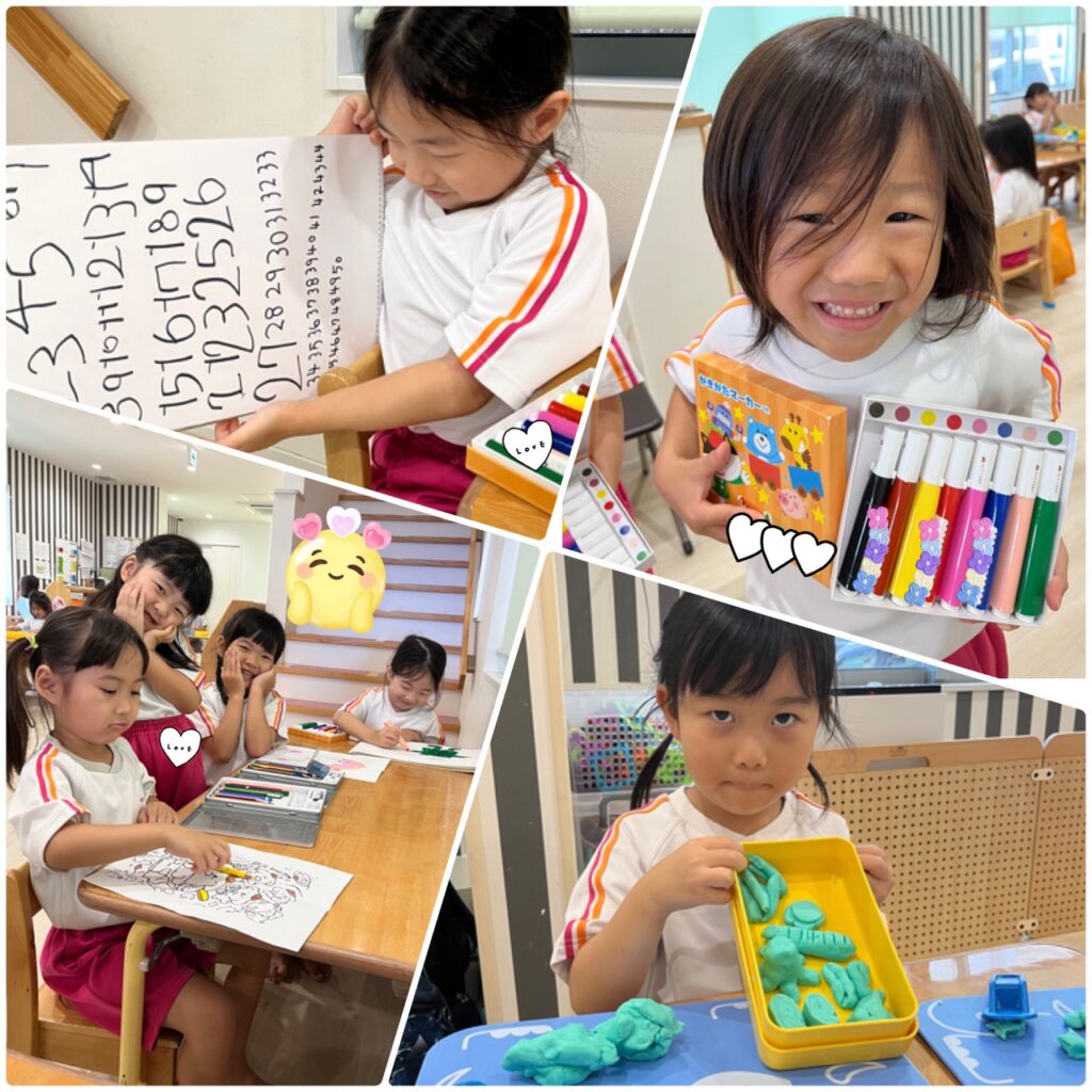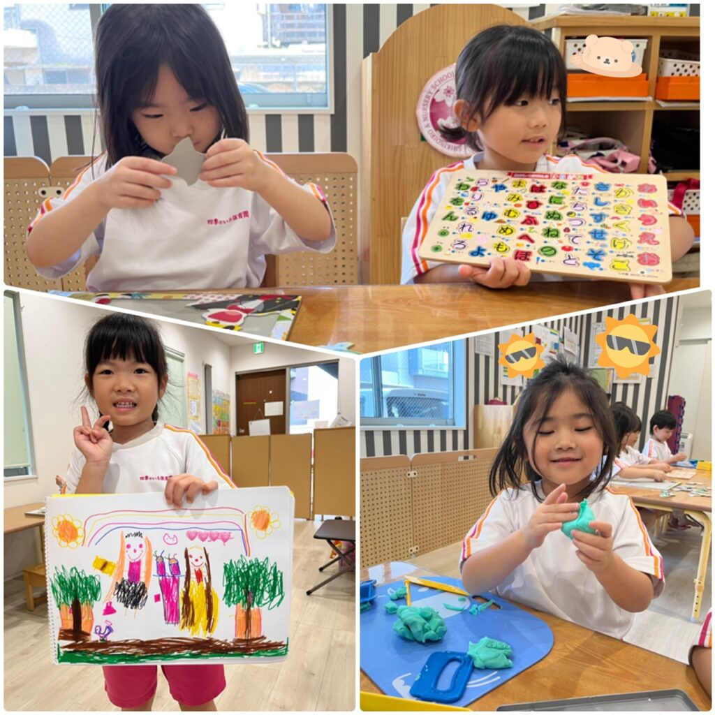 「へび作ったの~!」「お弁当だよ!」と粘土で作ったものを見せてくれたり、完成したパズルや絵もカメラに向けて見せてくれました☺