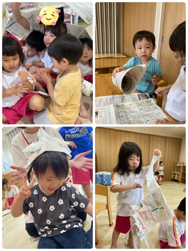 新聞紙で遊びました。剣を作ったり、お菓子をつくったよ~
