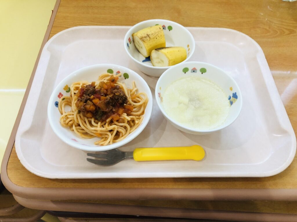 ミートソーススパゲッティー、じゃがいものスープ、バナナ