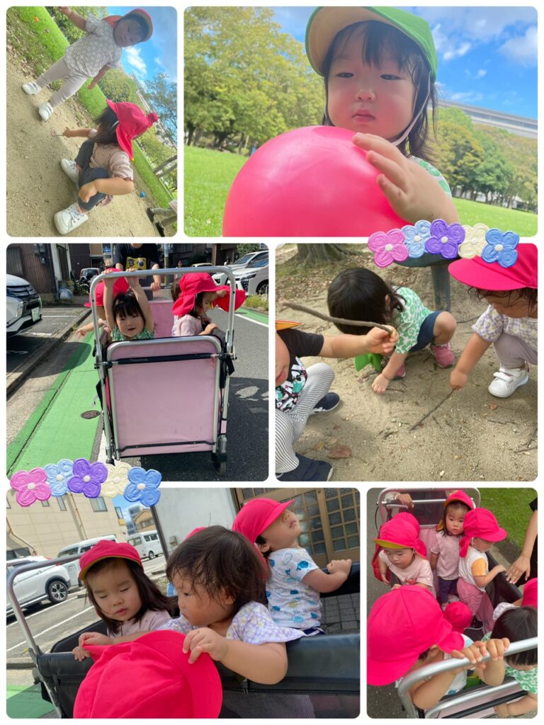 おひさま組さんは、楽器や様々なおもちゃで遊びました。音が鳴るとうれしそうで興味津々でしたよ♬ほし組さんは、お天気が悪くならないうちに公園へお散歩へ行きました☆ボールで遊んだり、木の枝を見つけたり、元気に走り回ったりして大興奮の子どもたちでした♡