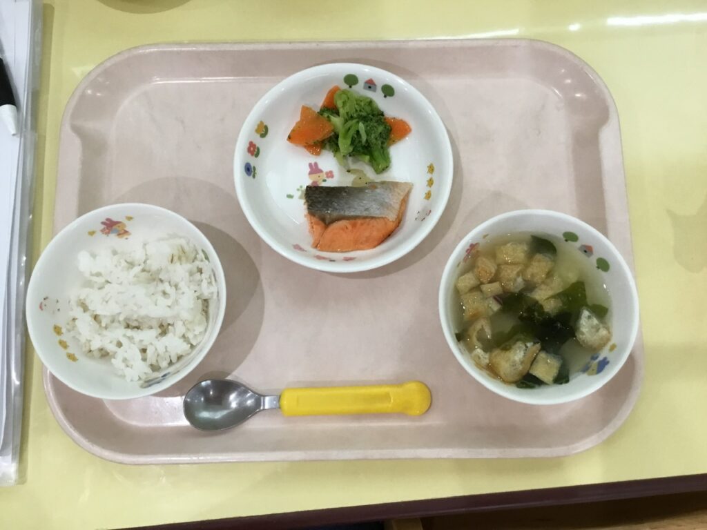 麦ごはん、みそ汁、鮭のレモン焼き、ブロッコリーのサラダ