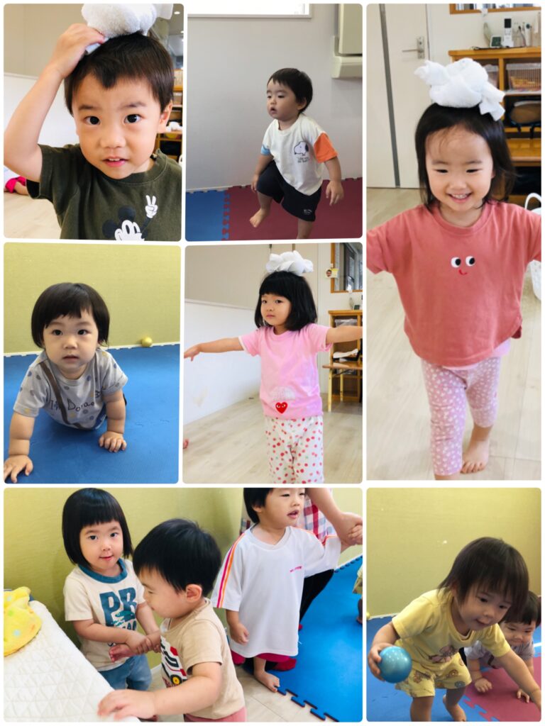 つき組のお友達は頭にタオルを乗せて上手に歩くことが出来ました~(^^)/