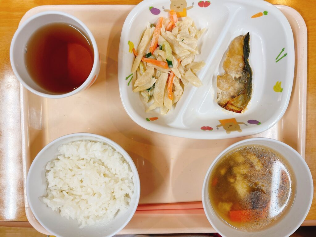 ご飯、アジの西京焼き、ごぼうサラダ、のっぺい汁