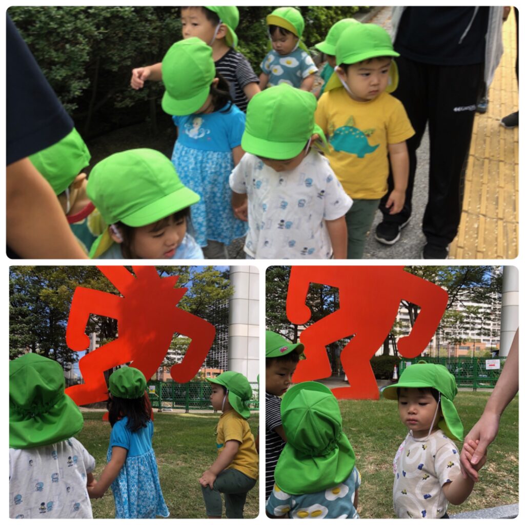 園の子どもたちは今日も元気いっぱいです。うさぎぐみ、ぱんだぐみ、ぞうぐみさんは近くの公園でかけっこをしました。上手にカーブを曲がることができています。