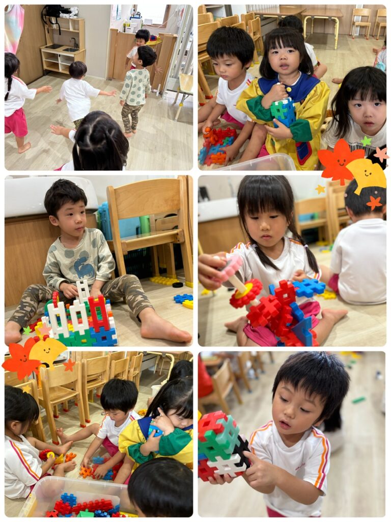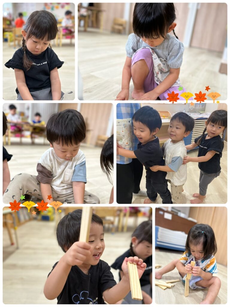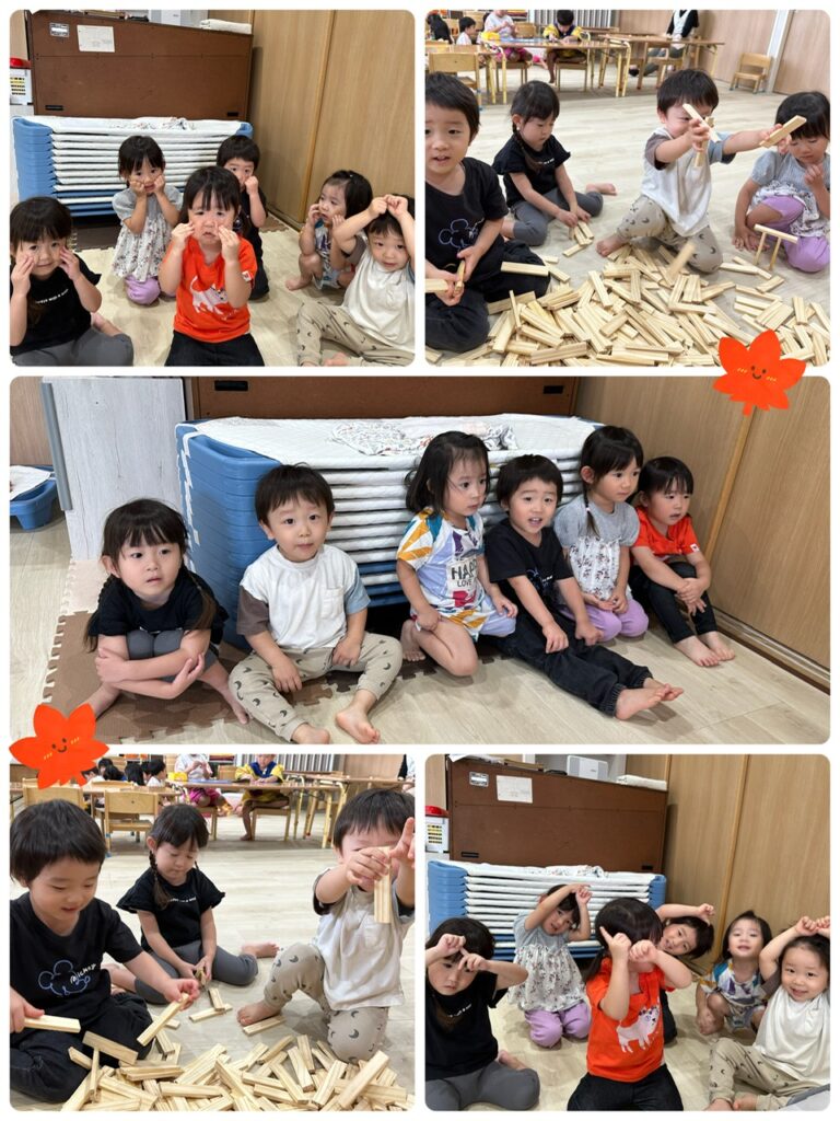 つき組さんは、スティッピーという積み木で遊びました!!高く積み上げたり、見立てたりしてお友達とお話しながら楽しそうに遊んでいましたよ♡