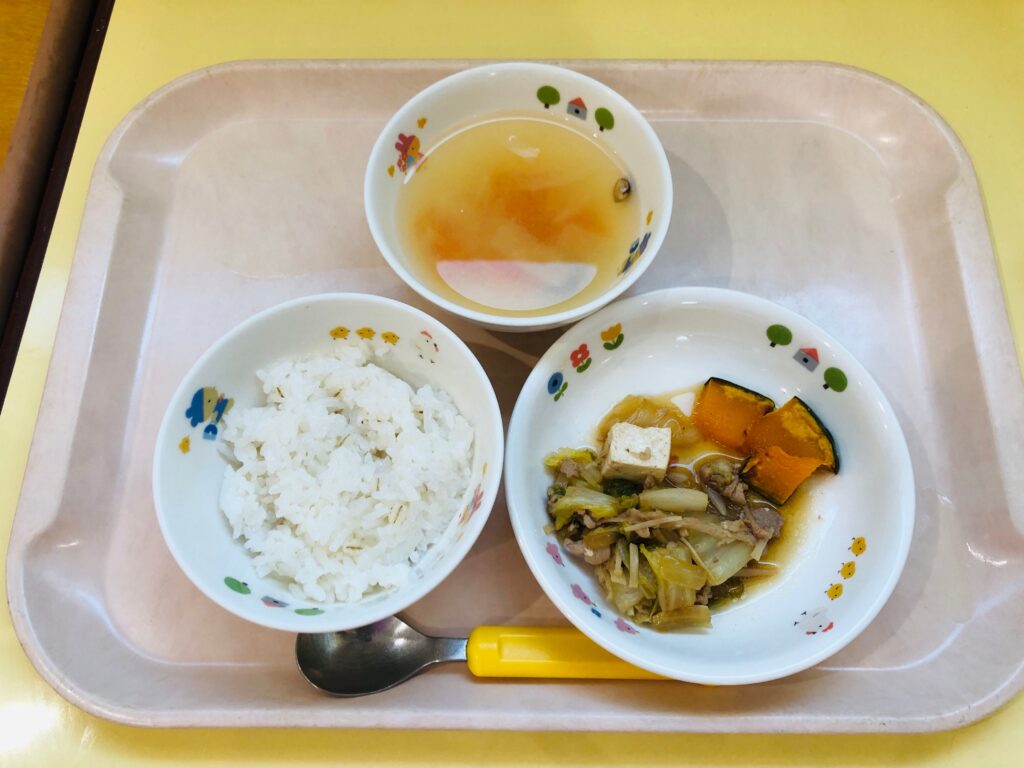 麦ご飯、みそ汁、豚肉のすき焼き風
