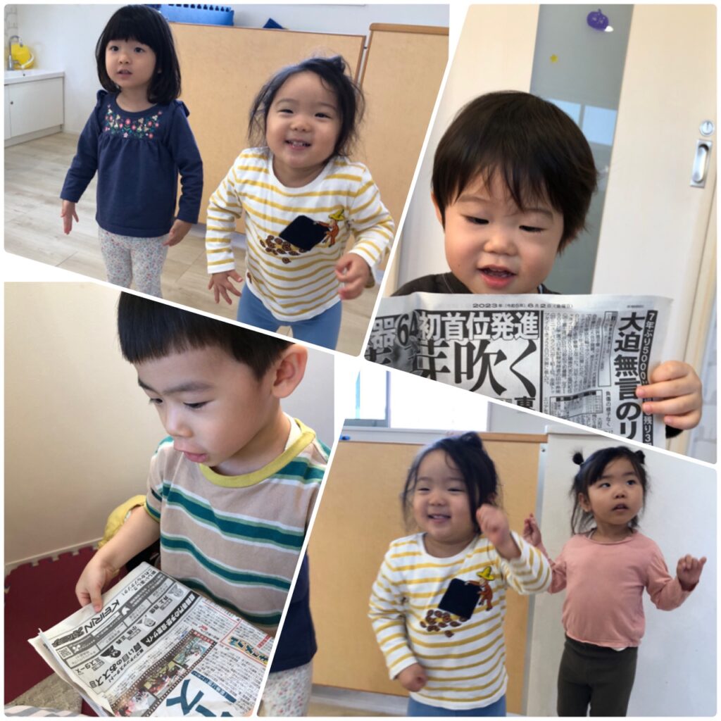 小さいお友達は新聞紙遊びに夢中でした♪