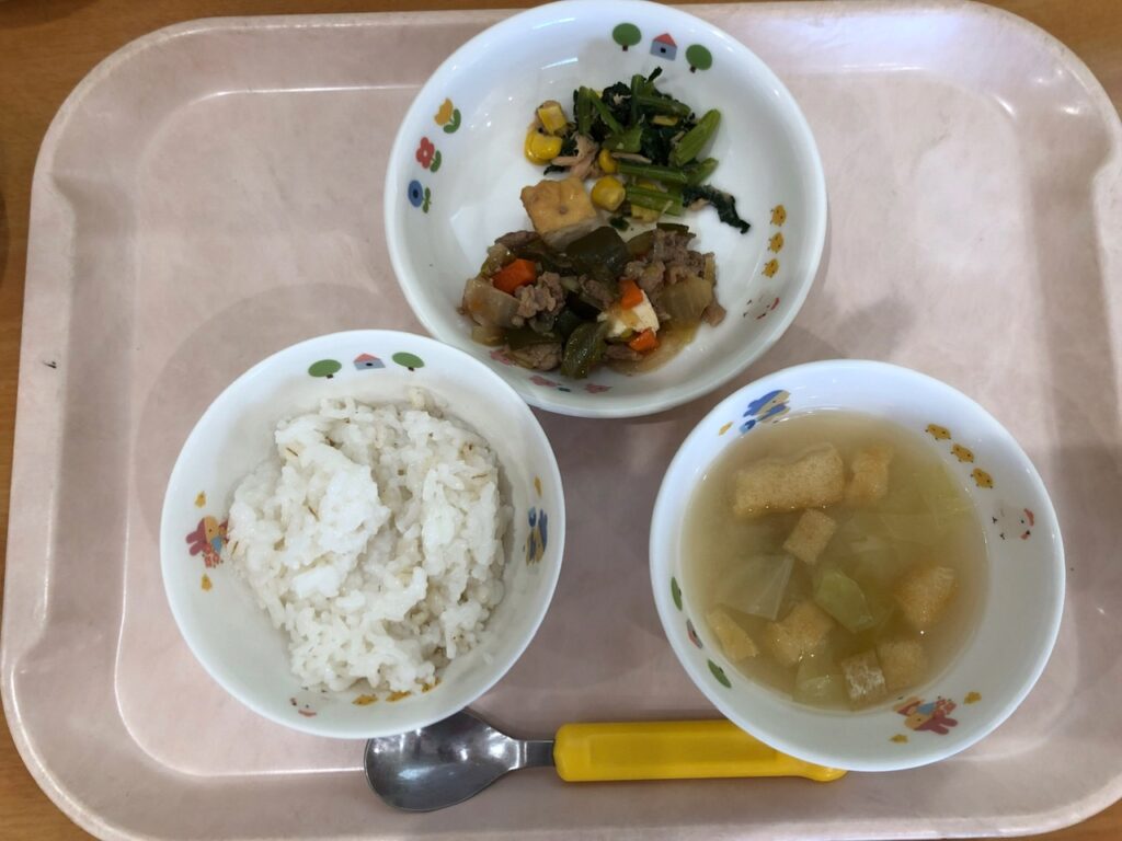 麦ごはん、みそ汁、厚揚げの中華煮、小松菜の和え物