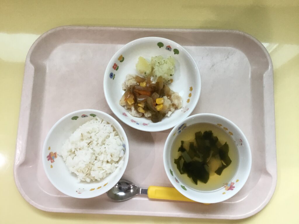 麦ごはん・わかめスープ・鶏ささみの甘酢あんかけ・粉ふきいも