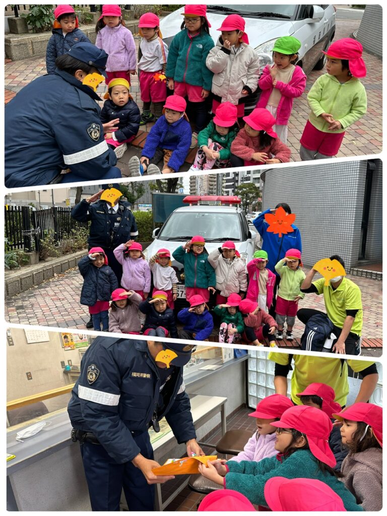 以上児さんは、交番まで勤労感謝のプレゼントを渡しに行きました!!お巡りさんやパトカーに大興奮の子どもたち♬最後は一緒に敬礼をして集合写真も撮りましたよ♡大喜びの子どもたちでした♬ダンス教室もありました!!
