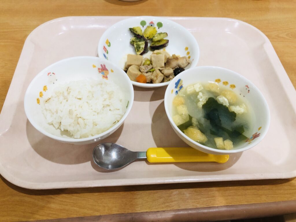 麦ごはん、みそ汁、高野豆腐のうま煮、磯辺さつまいも