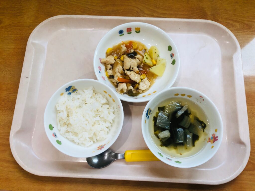 麦ごはん、わかめスープ、鶏ささ身の甘酢あんかけ、粉ふきいも