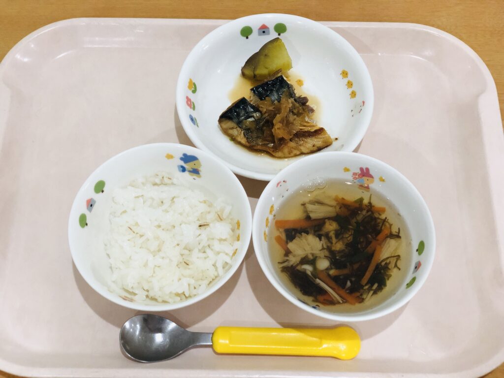 麦ごはん、もずくスープ、焼き魚(油淋ソースかけ)、さつま芋の甘煮