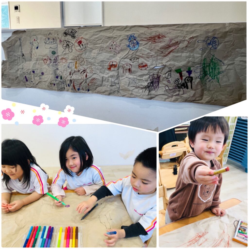 大きな一枚の紙にペンやクレヨンで自由にお絵描き!!