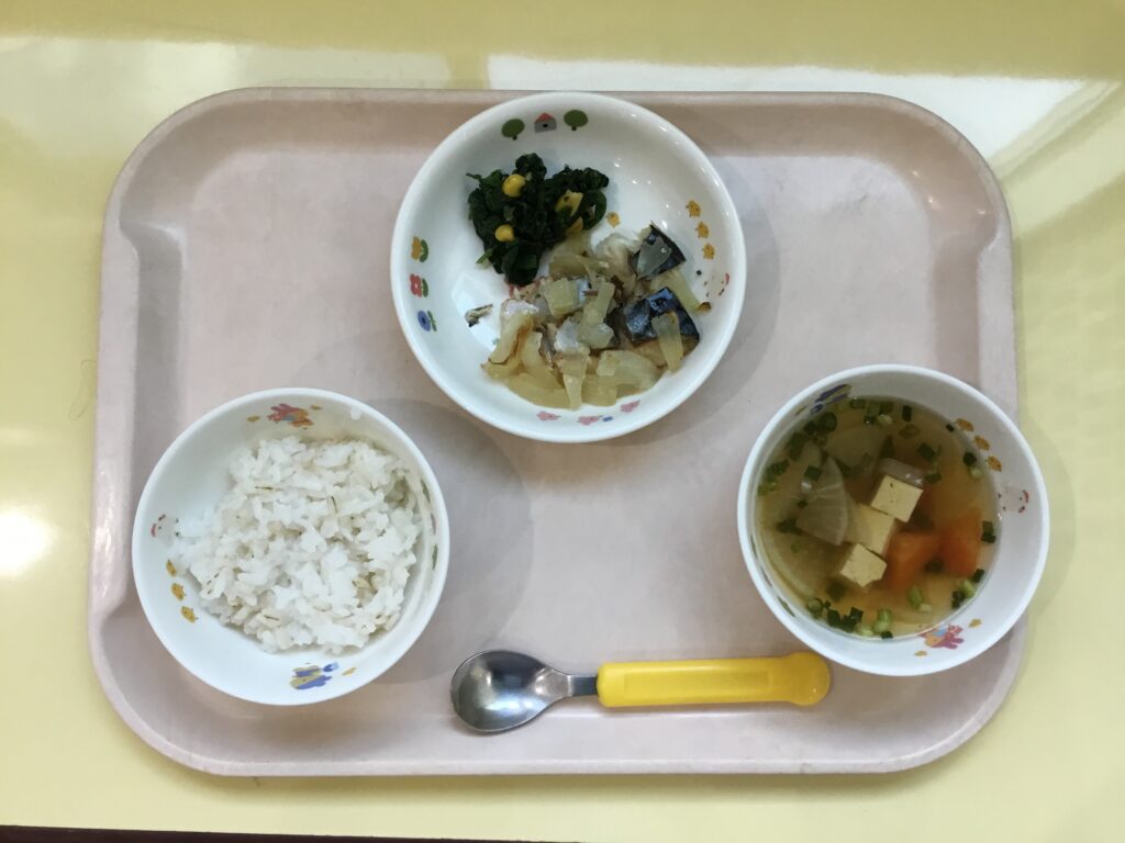 麦ごはん、けんちん汁、さばと玉ねぎの味噌煮、ほうれん草のおかか和え