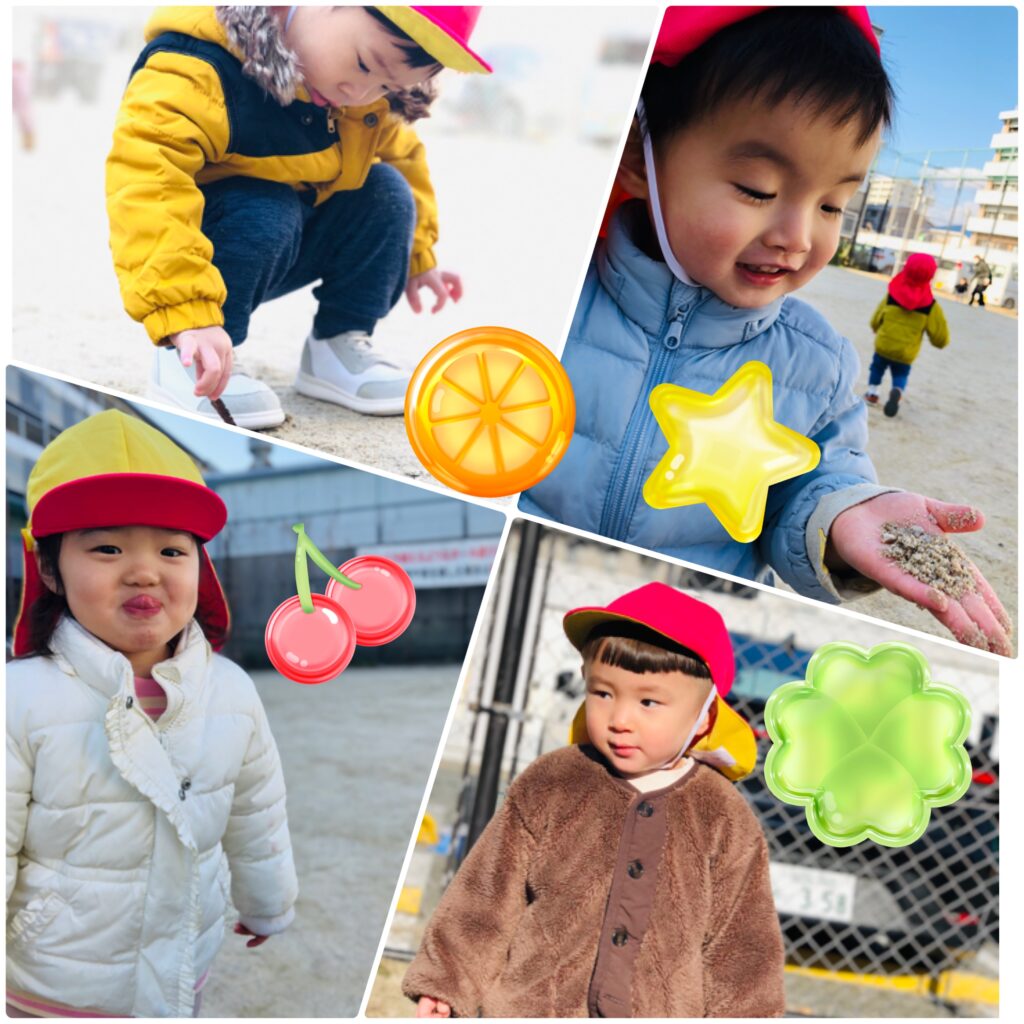 日差しが温かいお外で土や木の枝を触ってみたり、思い切り走ったりして遊びました♪