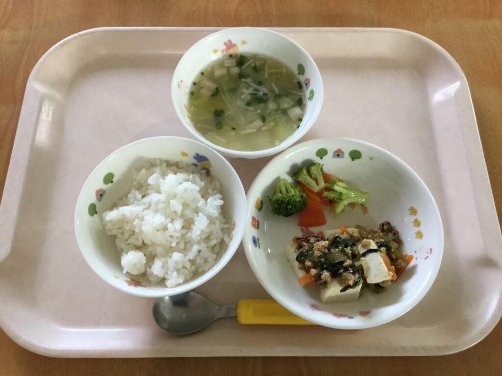 麦ごはん、みそ汁、豆腐の野菜そぼろがけ、ブロッコリーのサラダ