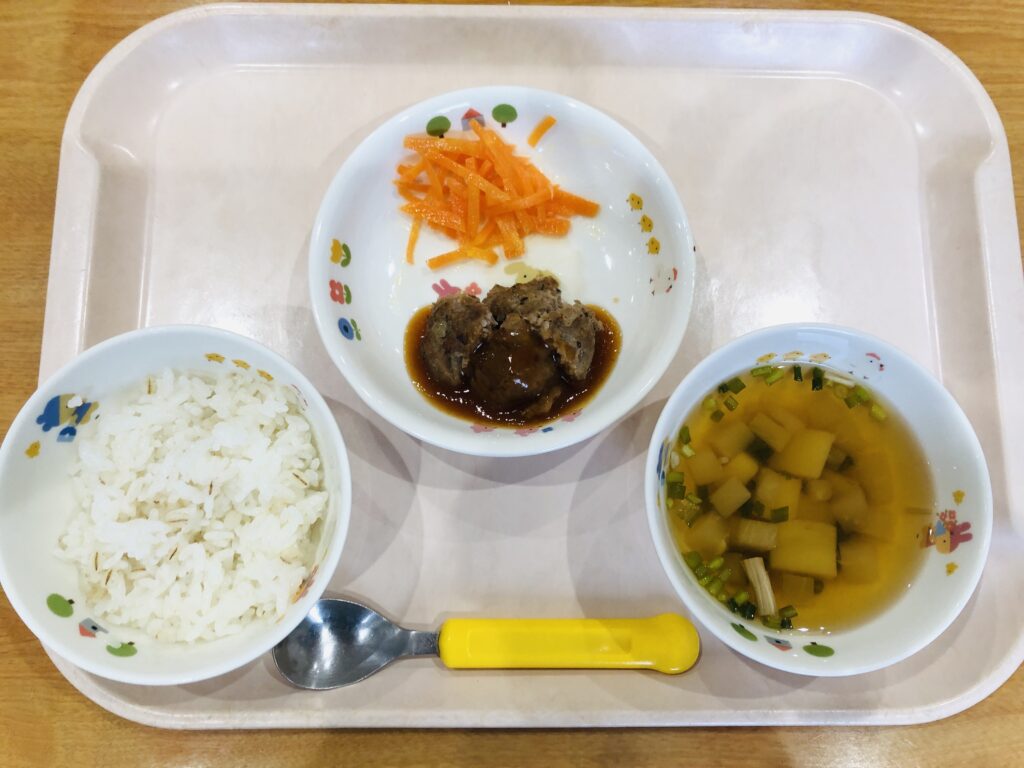 麦ごはん、じゃがいもとかぶのスープ、きのこハンバーグ、ニンジンラぺ
