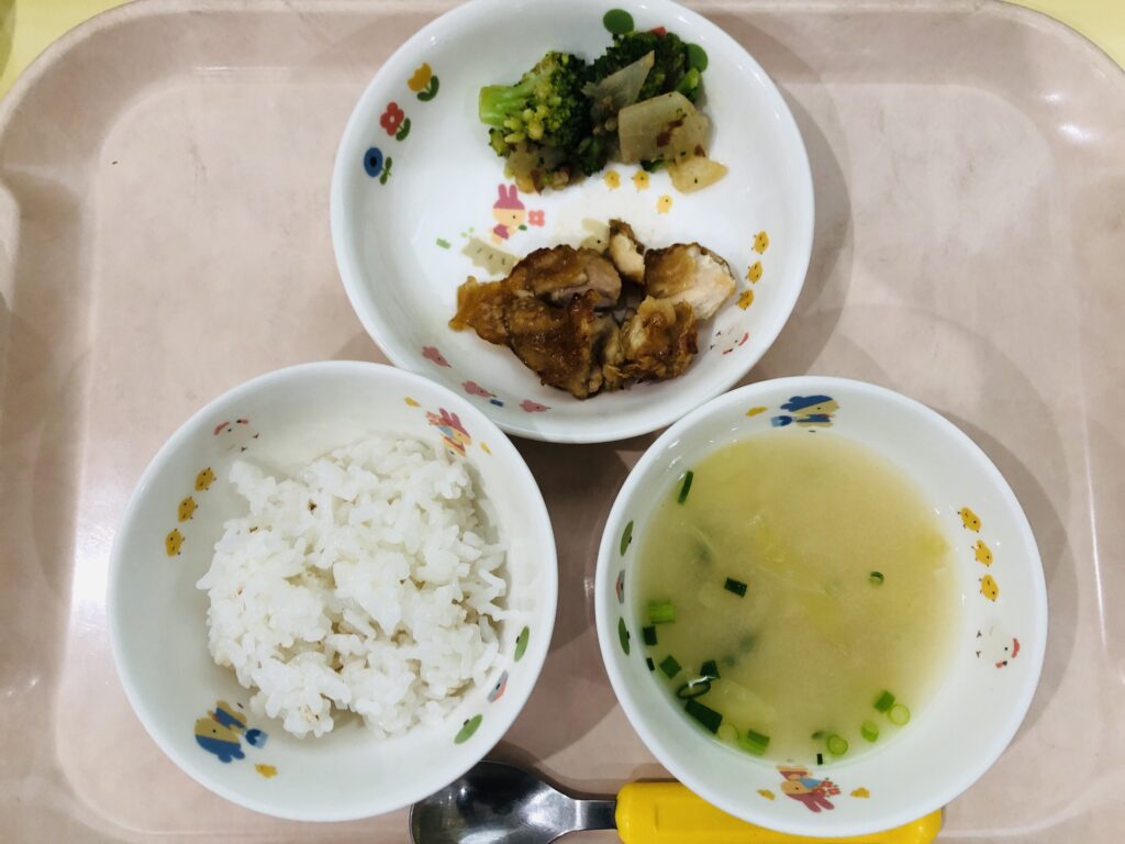麦ごはん、みそ汁、鶏のからあげ、かぶの梅和え