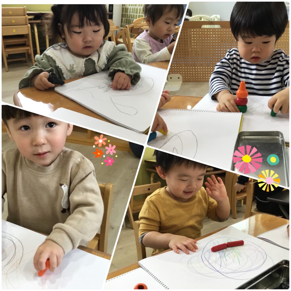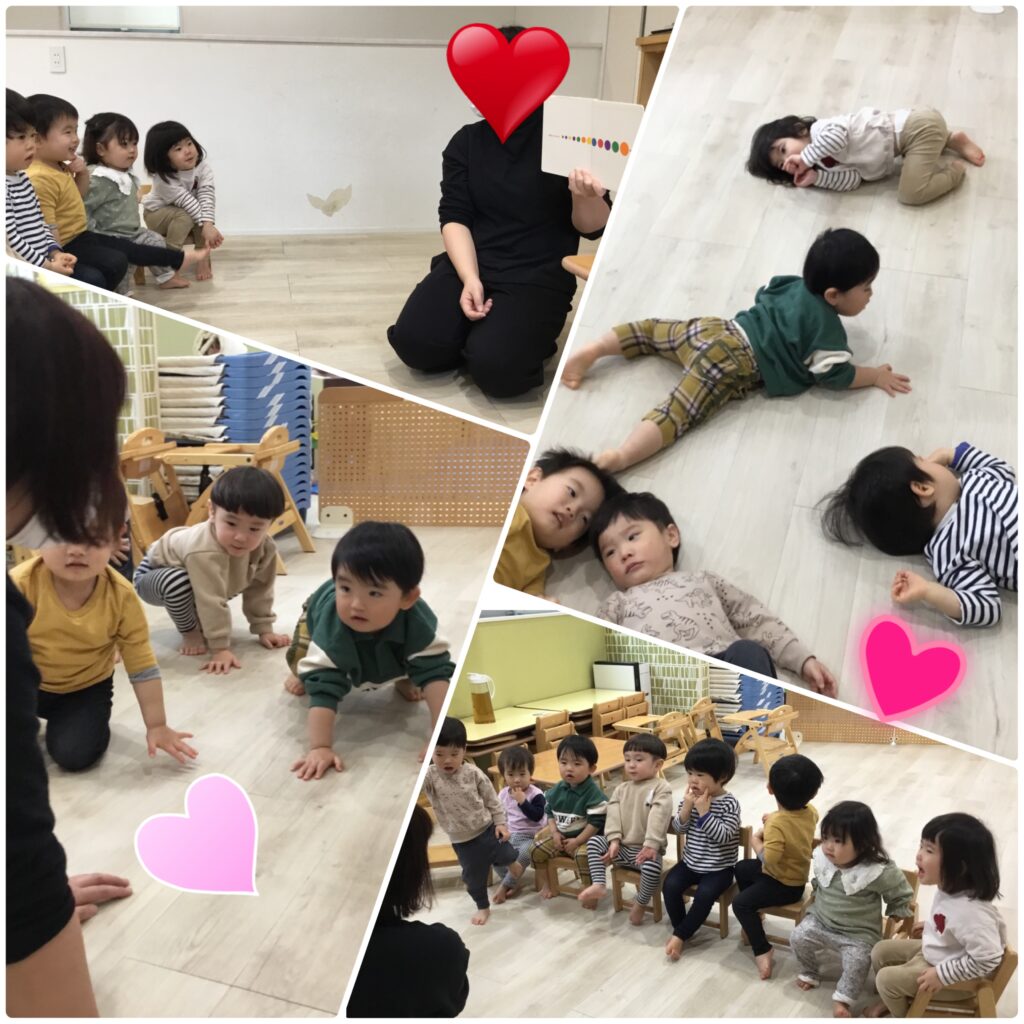 今日、0・1歳児さんクラスは絵本の読み聞かせやお絵描き、動物のまねっこ遊びなどをして