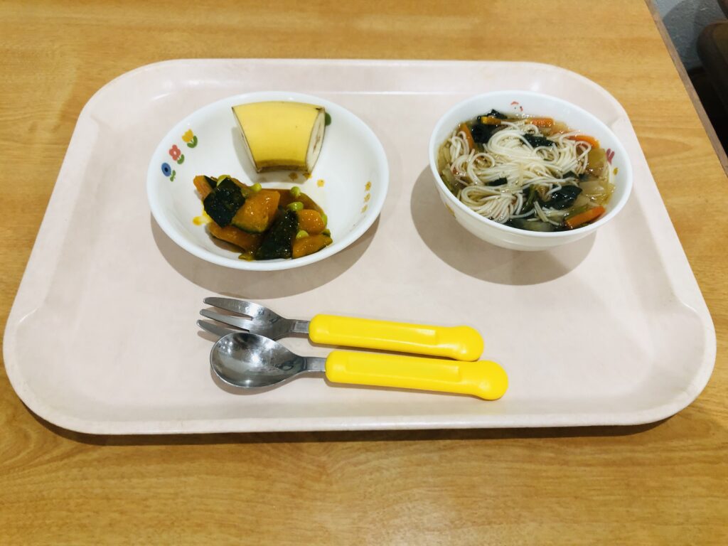 温そうめん、かぼちゃの枝豆あんかけ、バナナ