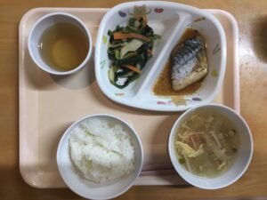ご飯、サバのウスターソース煮、ほうれん草のナムル、中華風かきたま汁