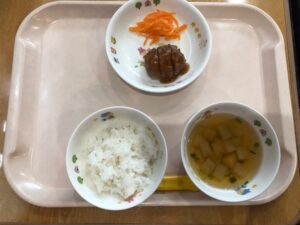 麦ごはん、じゃがいもと大根のスープ、きのこバーグ、人参ラぺ