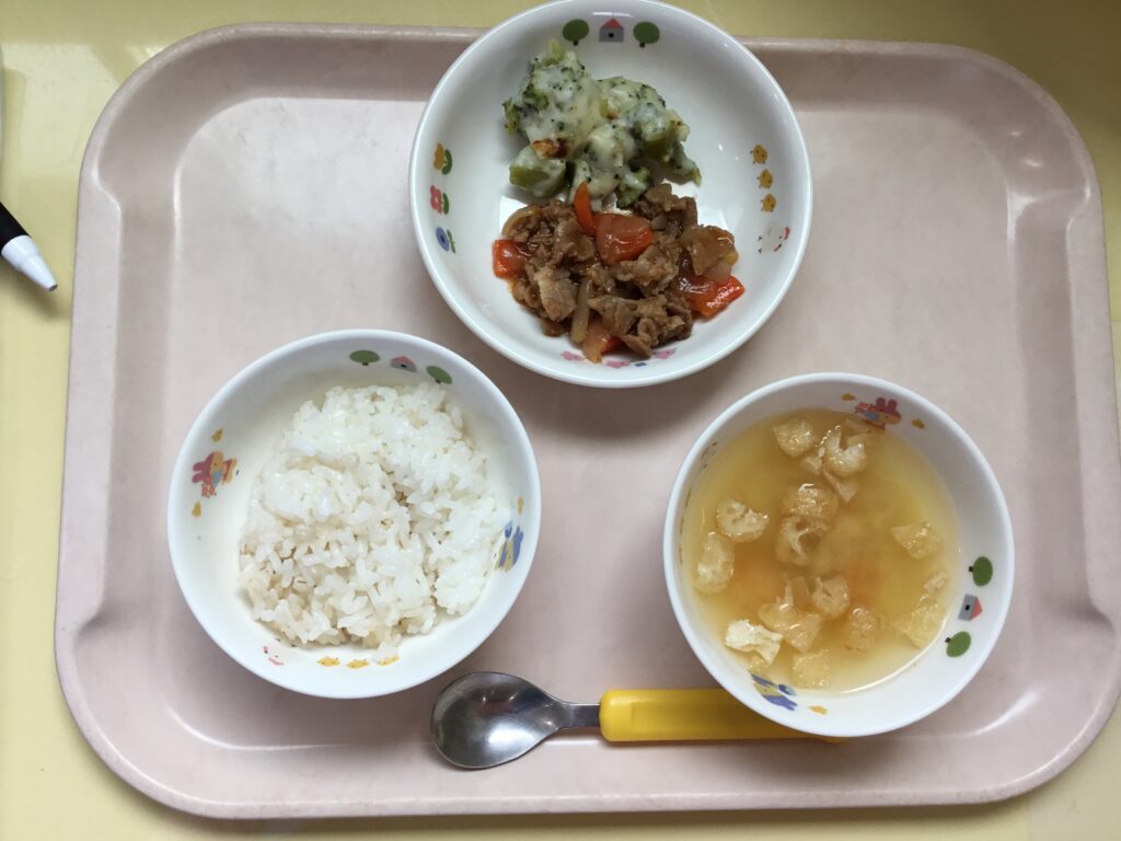 麦ご飯、みそ汁、ポークチャップ、ブロッコリーのチーズ焼き