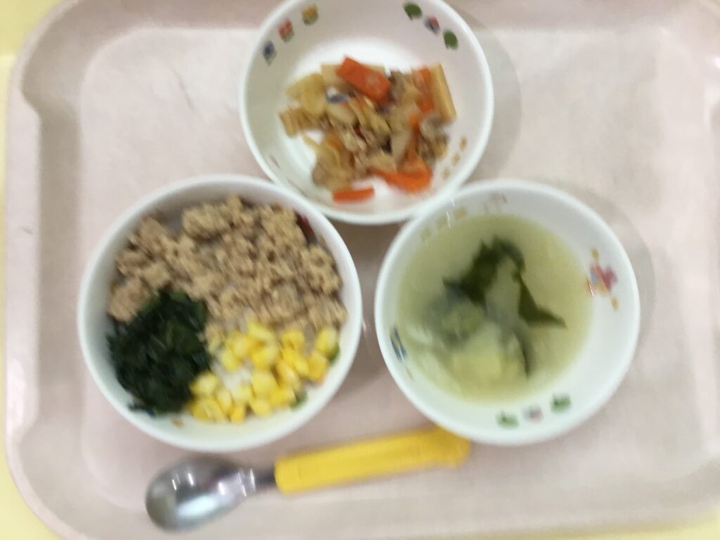 【こんだて】三色そぼろ丼、みそ汁、たけのこ入り野菜いため