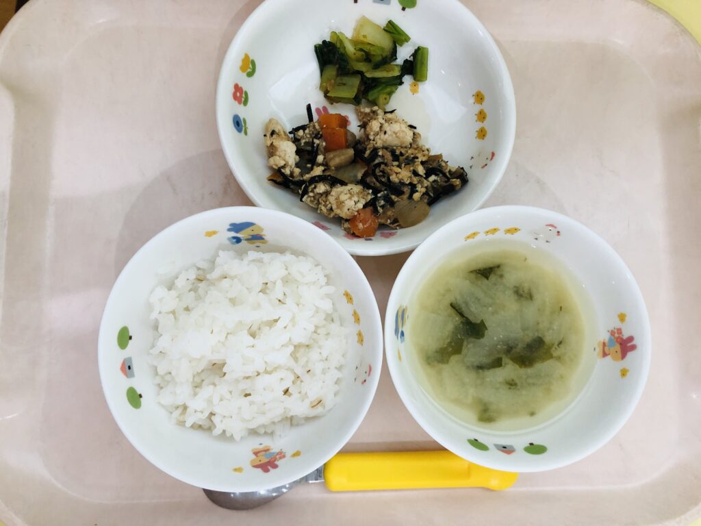 麦ご飯、みそ汁、炒り豆腐(ツナひじき)、チンゲンサイのおかかあえ