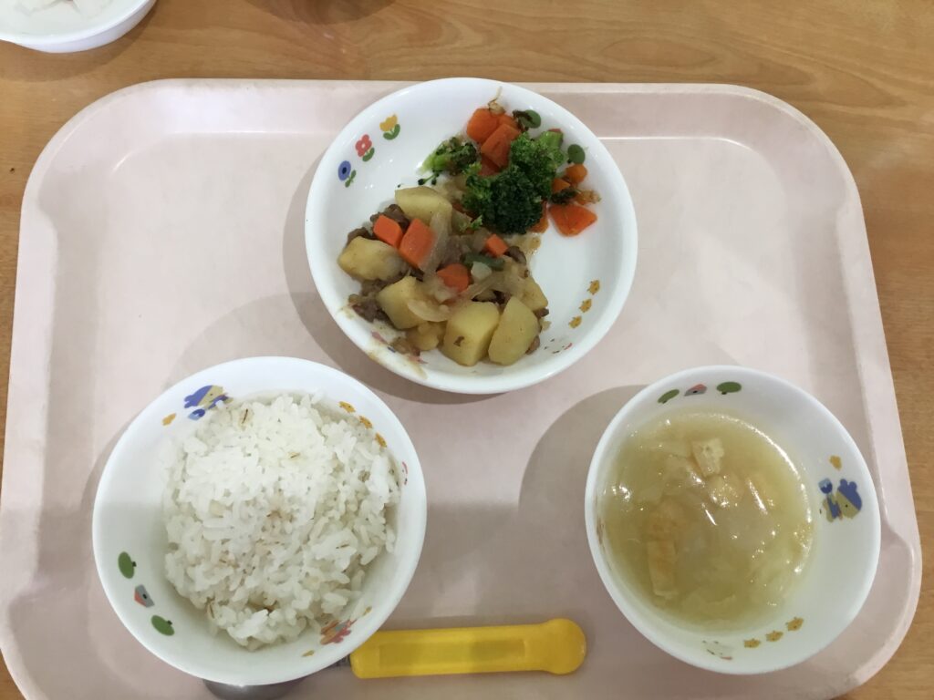 麦ごはん、肉じゃが、ブロッコリーとニンジンのおかか和え、みそ汁