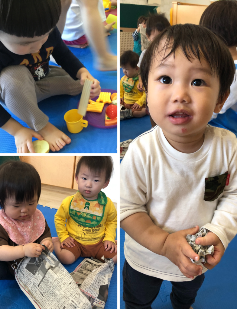 新聞紙やおもちゃで遊びました~(天気はよかったけど外は強風でしたね。)