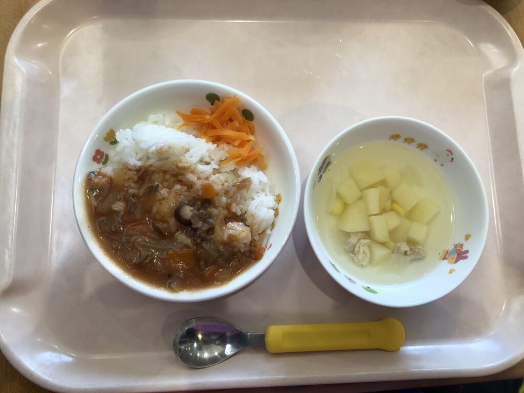ハヤシライス、じゃがいものスープ、にんじんラペ
