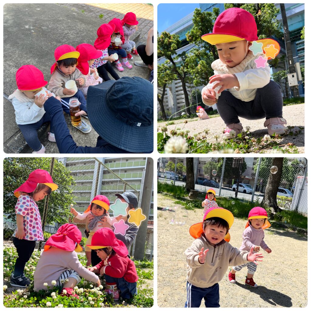 かわいいお花を摘んだり、シャボン玉を追いかけて走ったり、ボールで遊んだり、
