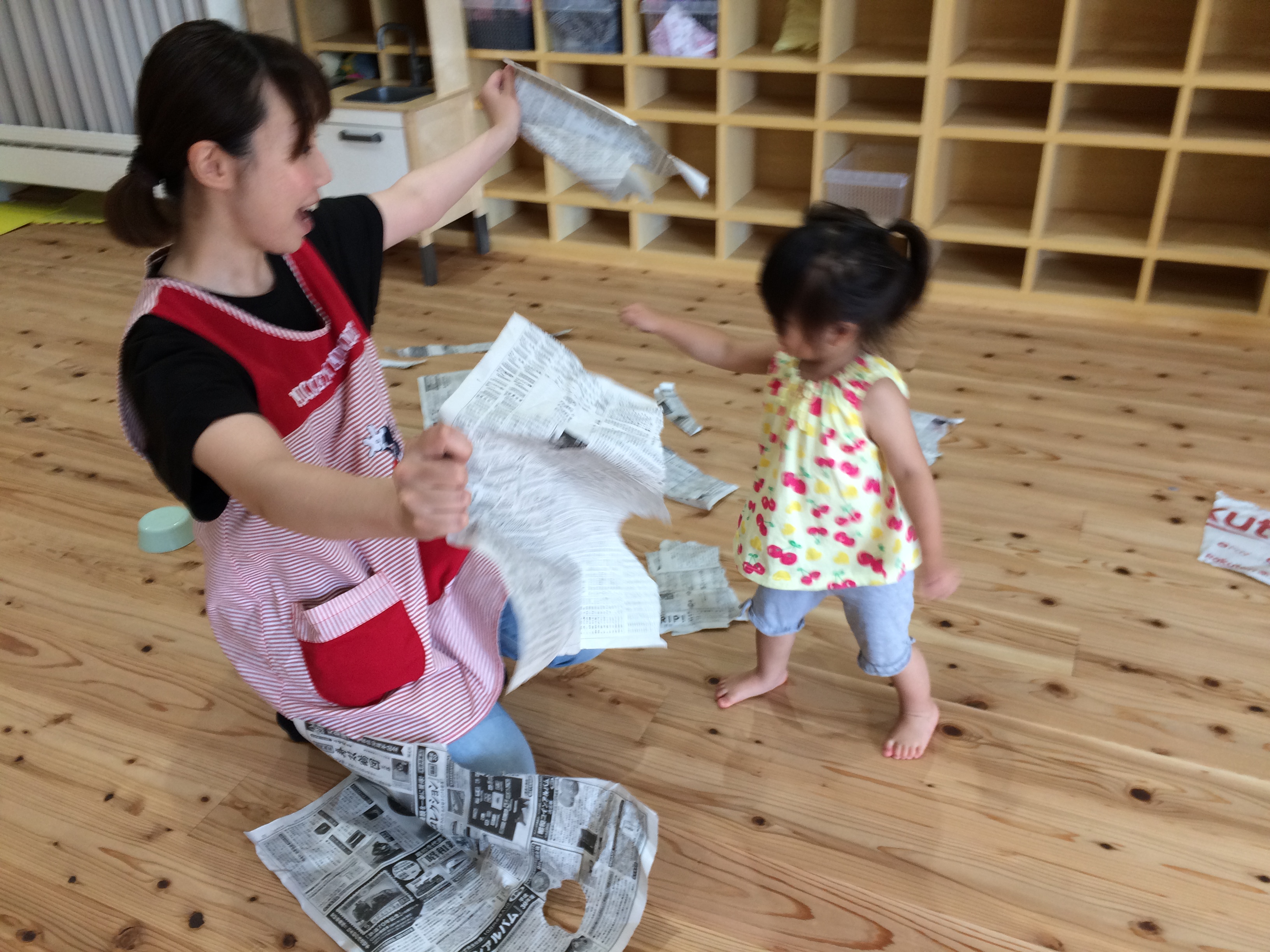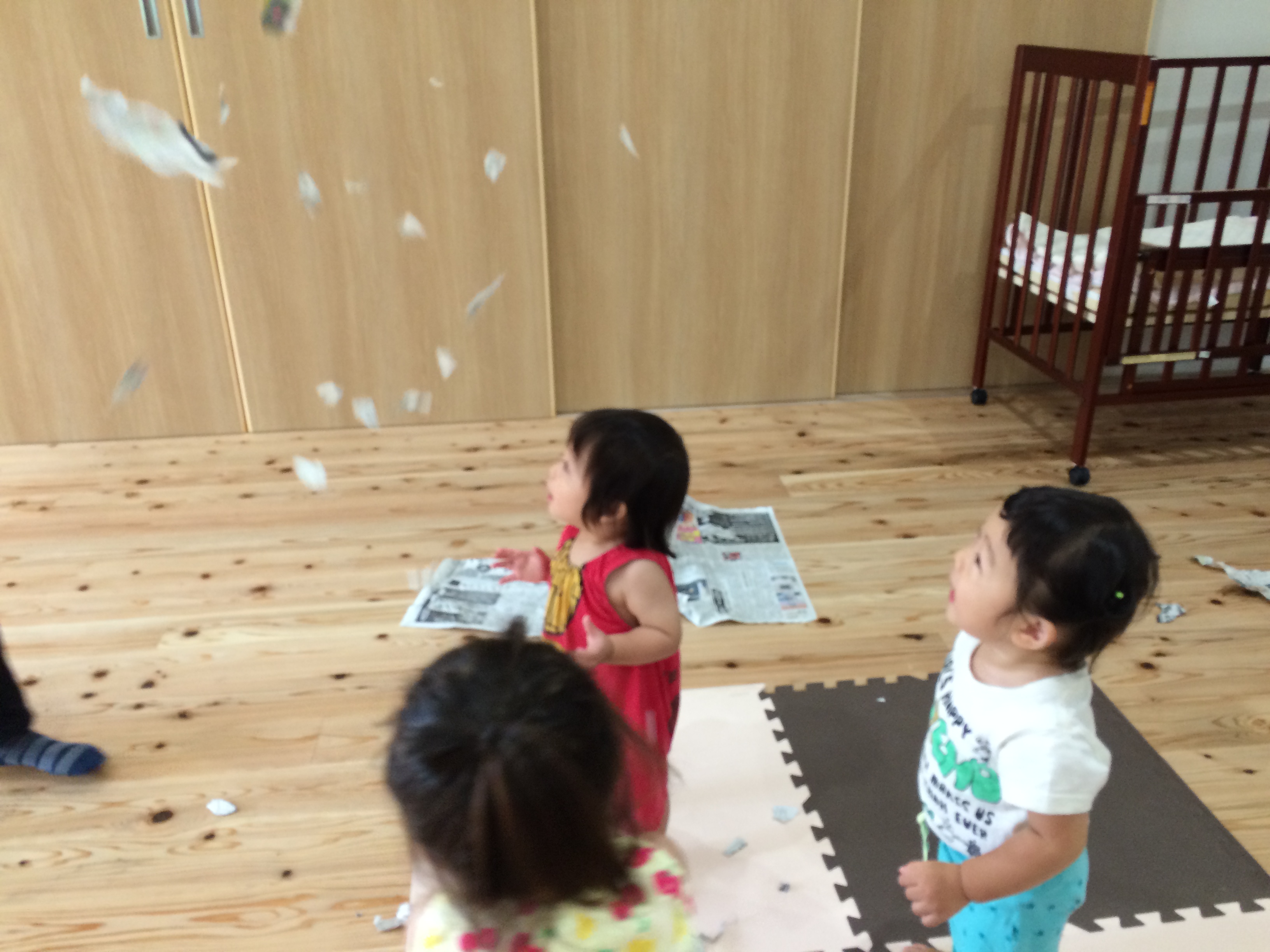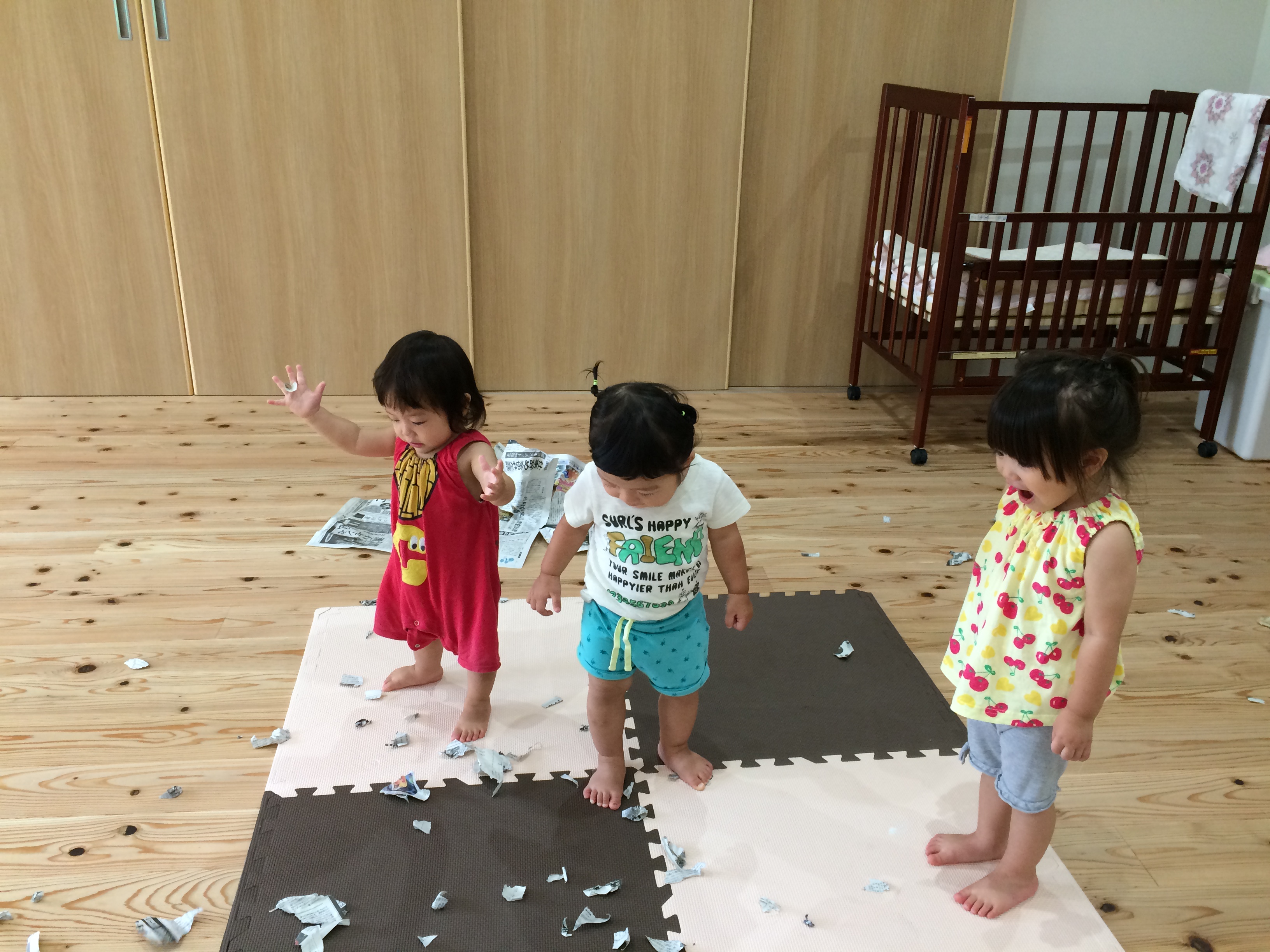 3歳さんYちゃんがプラネタリウムに行っている間、他のお友達はお部屋で「新聞紙あそび」をしました。
