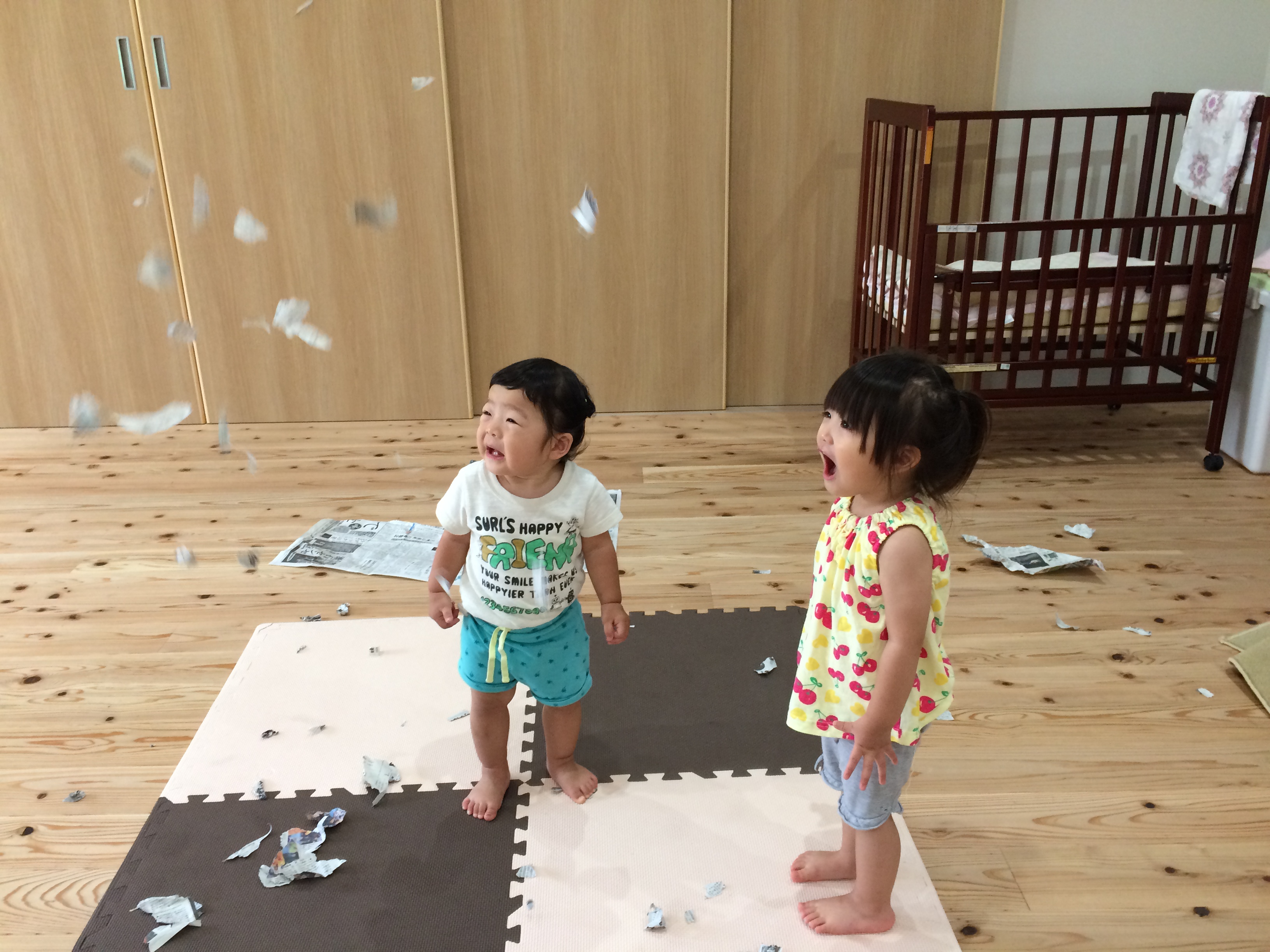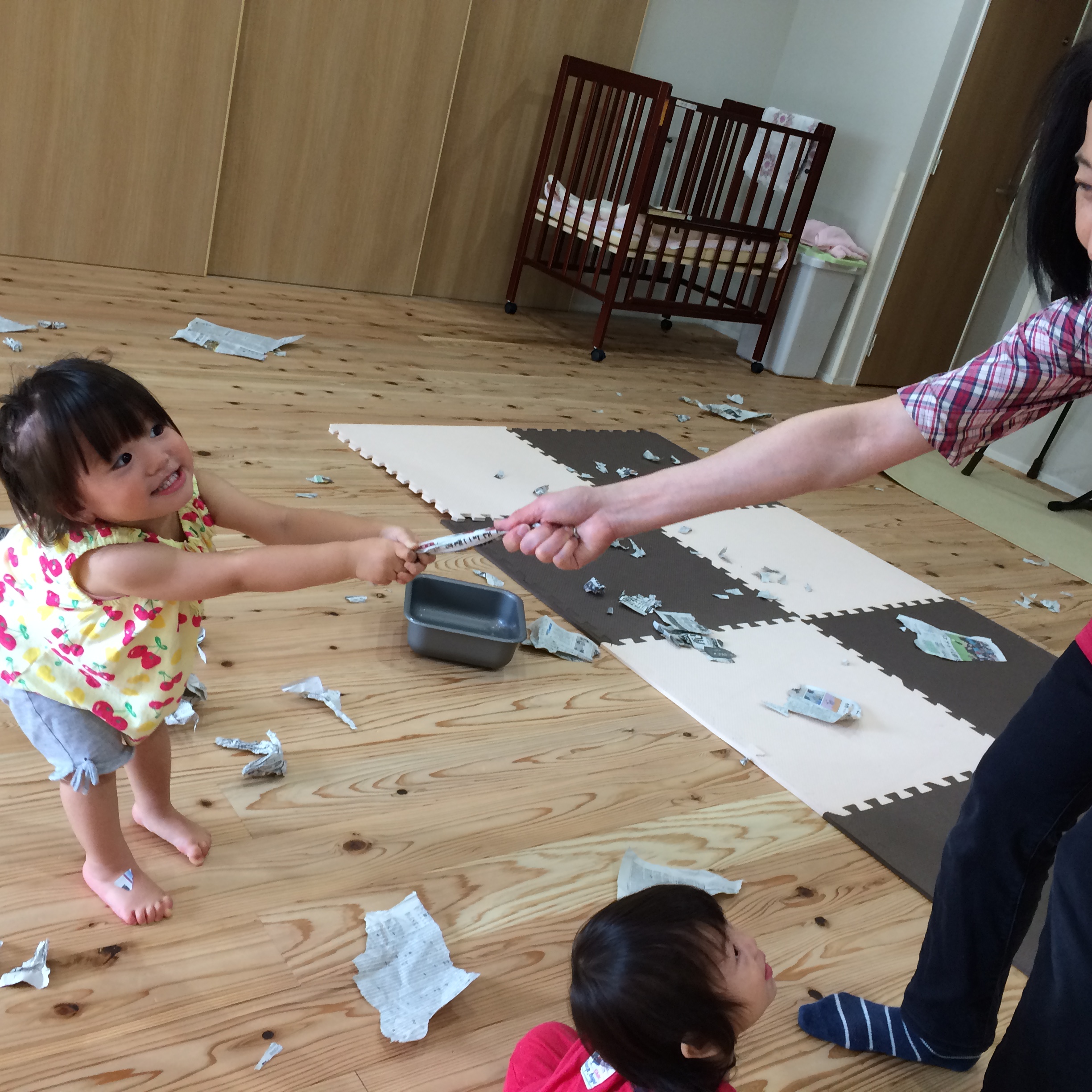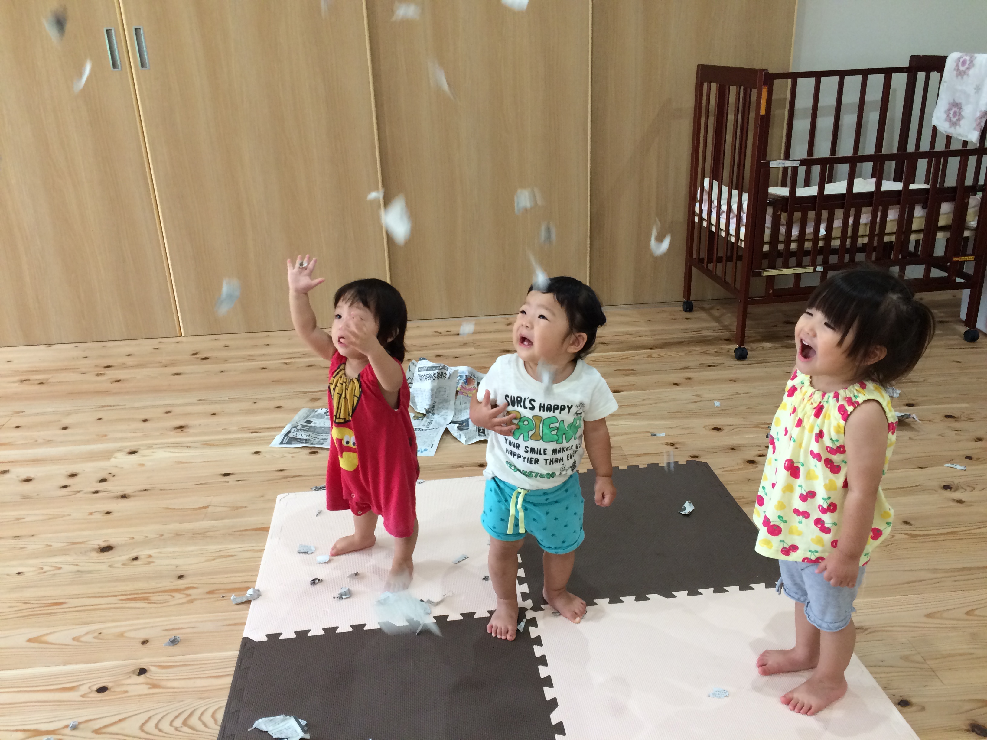 3歳さんYちゃんがプラネタリウムに行っている間、他のお友達はお部屋で「新聞紙あそび」をしました。